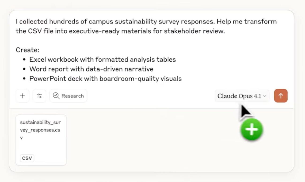 Sample Prompt: I collected hundreds of campus sustainability survey responses. Help me transform the CSV file into executive-ready materials for stakeholder review. Create: Excel workbook with formatted analysis tables, Word report with data-driven narrative, PowerPoint deck with boardroom-quality visuals