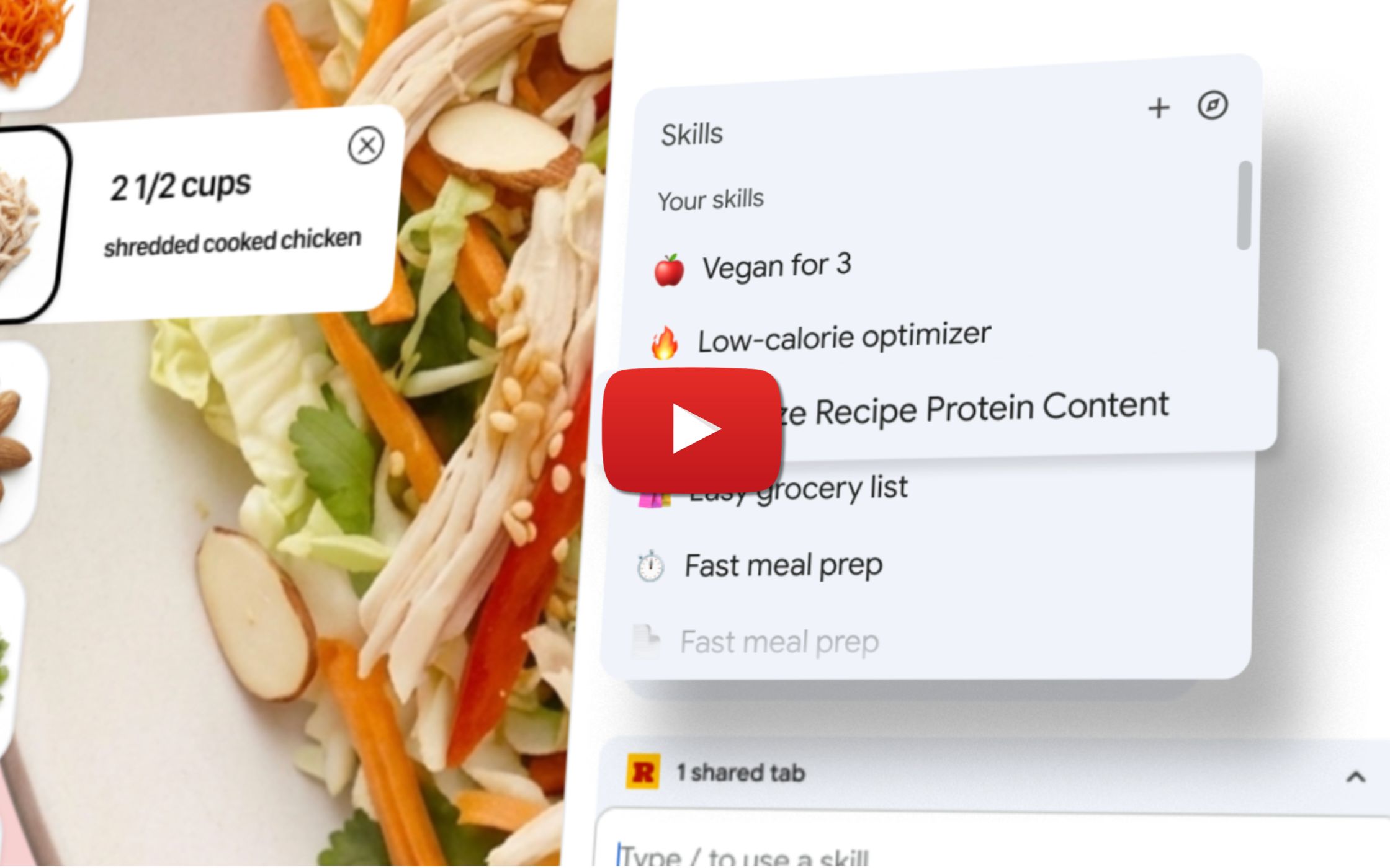 1. Chrome gets Skills to speed up your work: Skills let you save your favorite AI prompts so you can reuse them as one-click workflows, instead of retyping them over and over (such as scanning documents or calculating calories). Alongside the launch, Gemini rolled out a library of ready-to-use Skills for common tasks. To try it, click “Ask Gemini” in the top right corner to open Gemini in Chrome and type a forward slash ( / ). Rolling out now. Watch Skills in action.