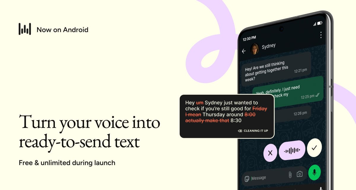 Free and unlimited on Android during launch. Try Wispr Flow.