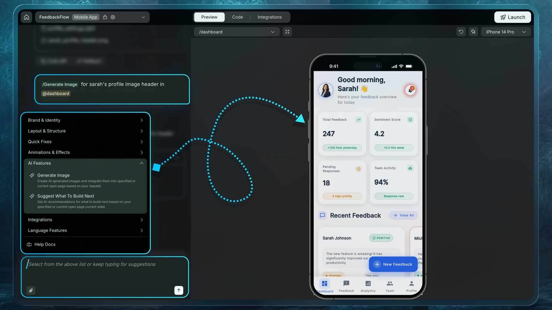 Sample prompt: "Build an AI-native mobile app that helps teams track customer feedback in real time, with a home screen, feedback list, and feedback detail view."Open app preview, pick a screen, and open chat.