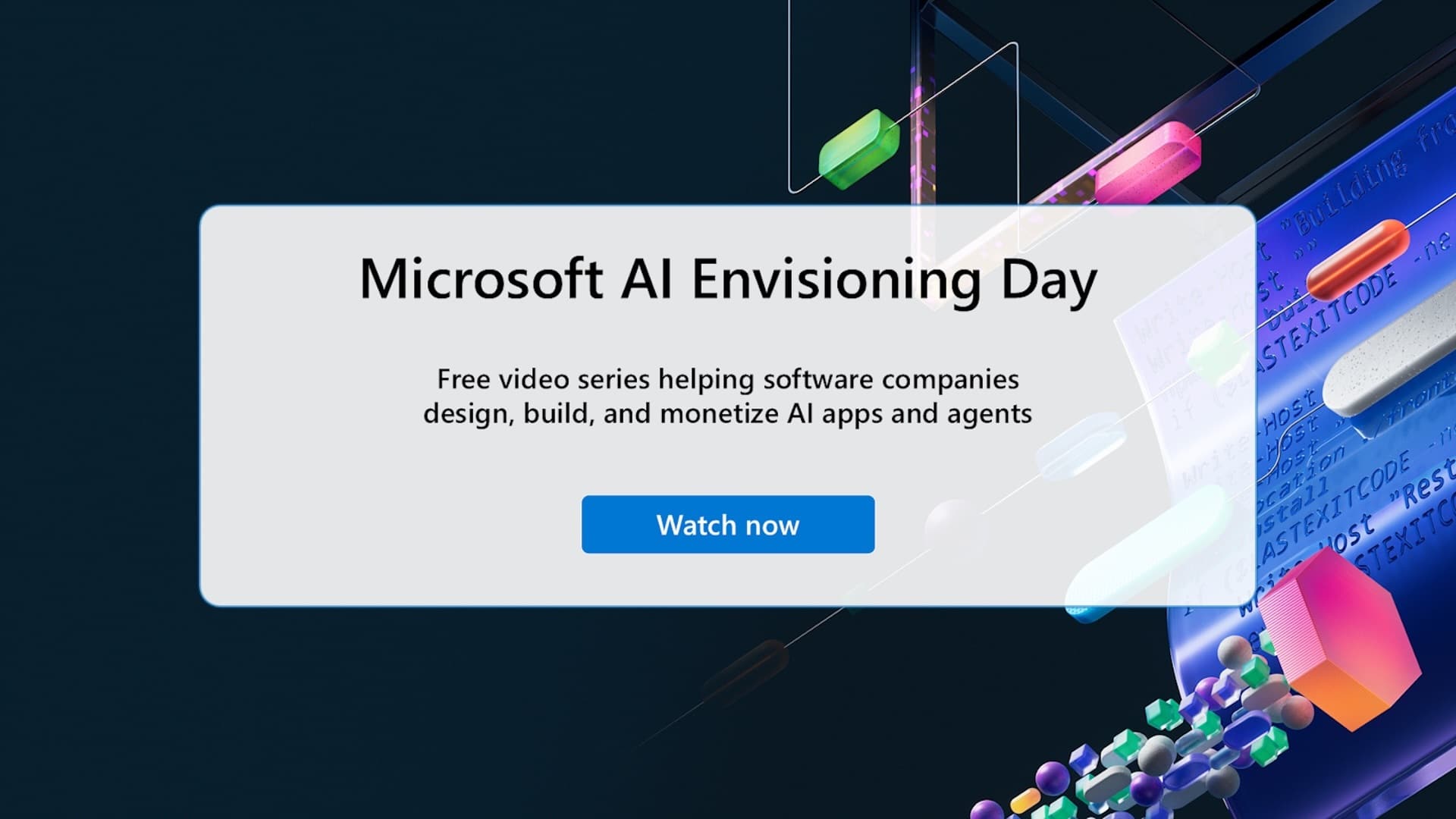 Microsoft AI Envisioning Day is a free video series helping software companies design, build, and monetize enterprise-ready AI apps and agents with proven patterns, technical resources, and exclusive offers to accelerate your path to market.